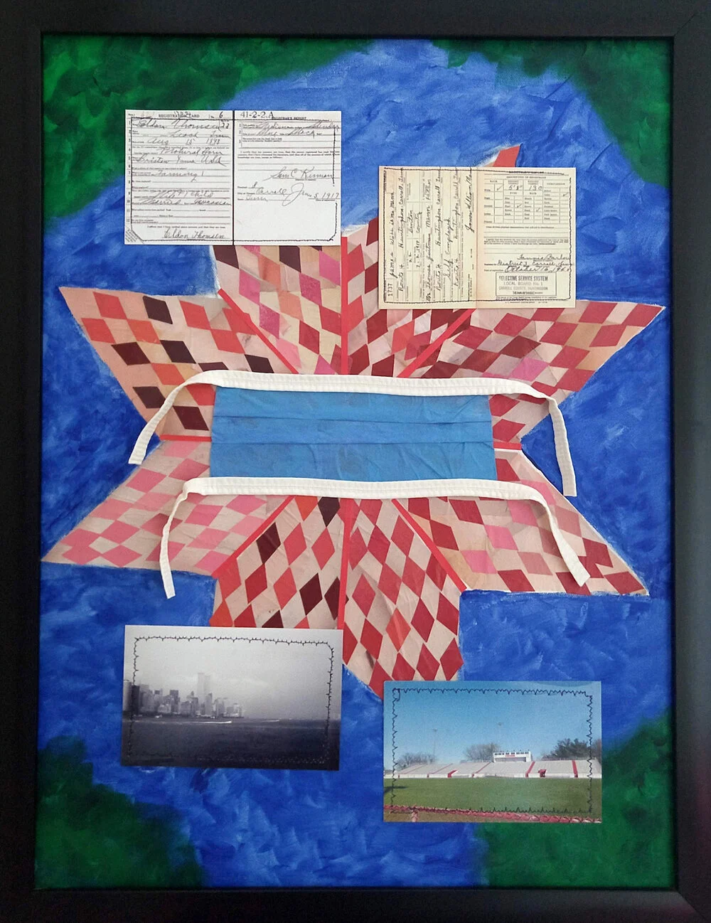 Hanging in my daughter's room is a quilt made by my great-grandmother, Ma Nona, who survived WW2 and the Great Depression. Inspired by her sewing skills and my memories of her, I created this mixed-media composition using photos I took of the New York City skyline just two weeks before 9/11, another unbelievable and challenging moment in US history. The shapes and composition are reminiscent of Ma Nona’s quilt, accented by postcards she sent and a face mask to symbolize the current times.